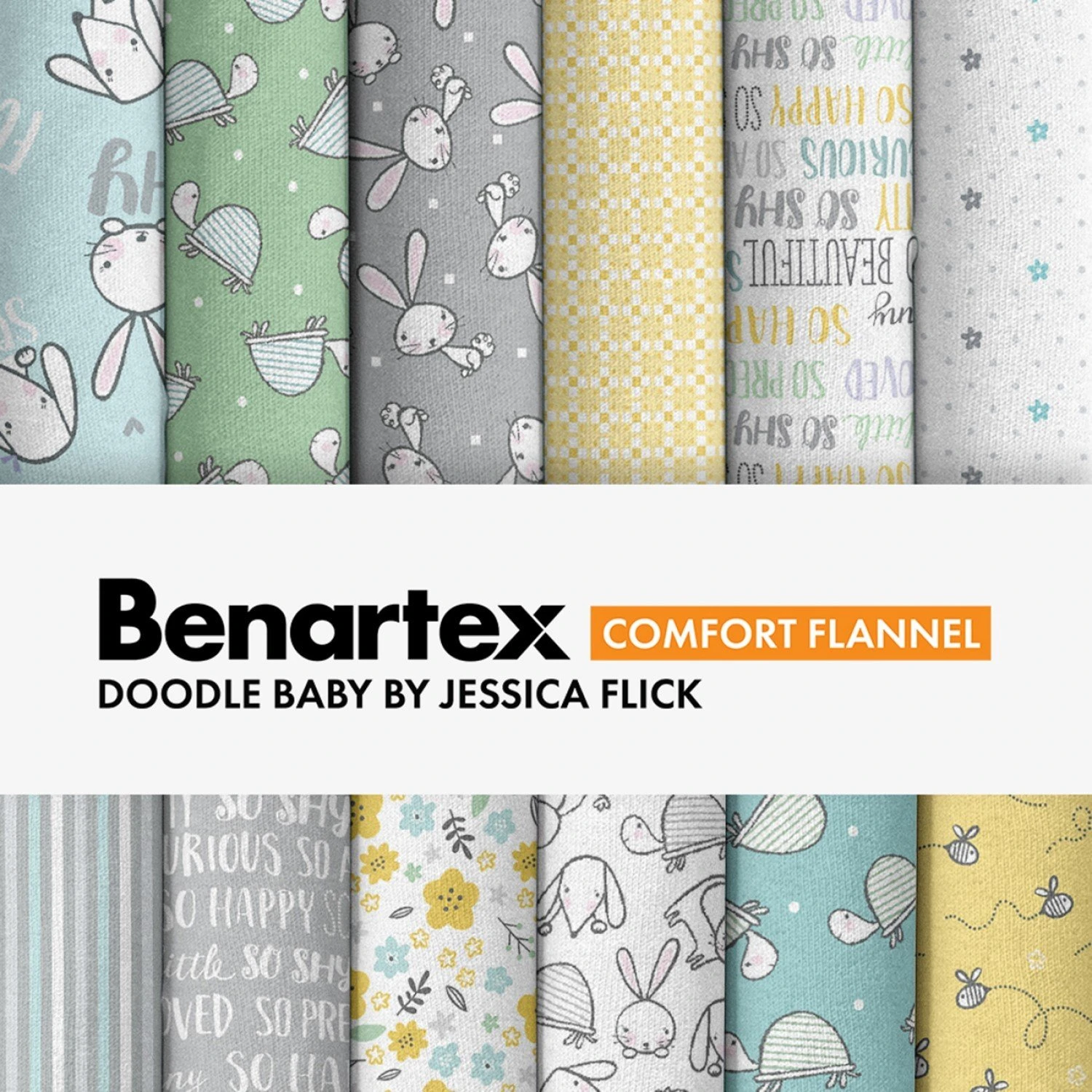 Doodle Baby Flannel Raggy Cakes Quilt Kit Benartex. Approx 54″ x 63″. Includes 2 10″ layer cakes of 42 squares each for front/back of ragtime quilt. Basic pattern included. For a larger quilt: try 4 layer cakes or 2 raggy cakes packs for 76″ x 95″.