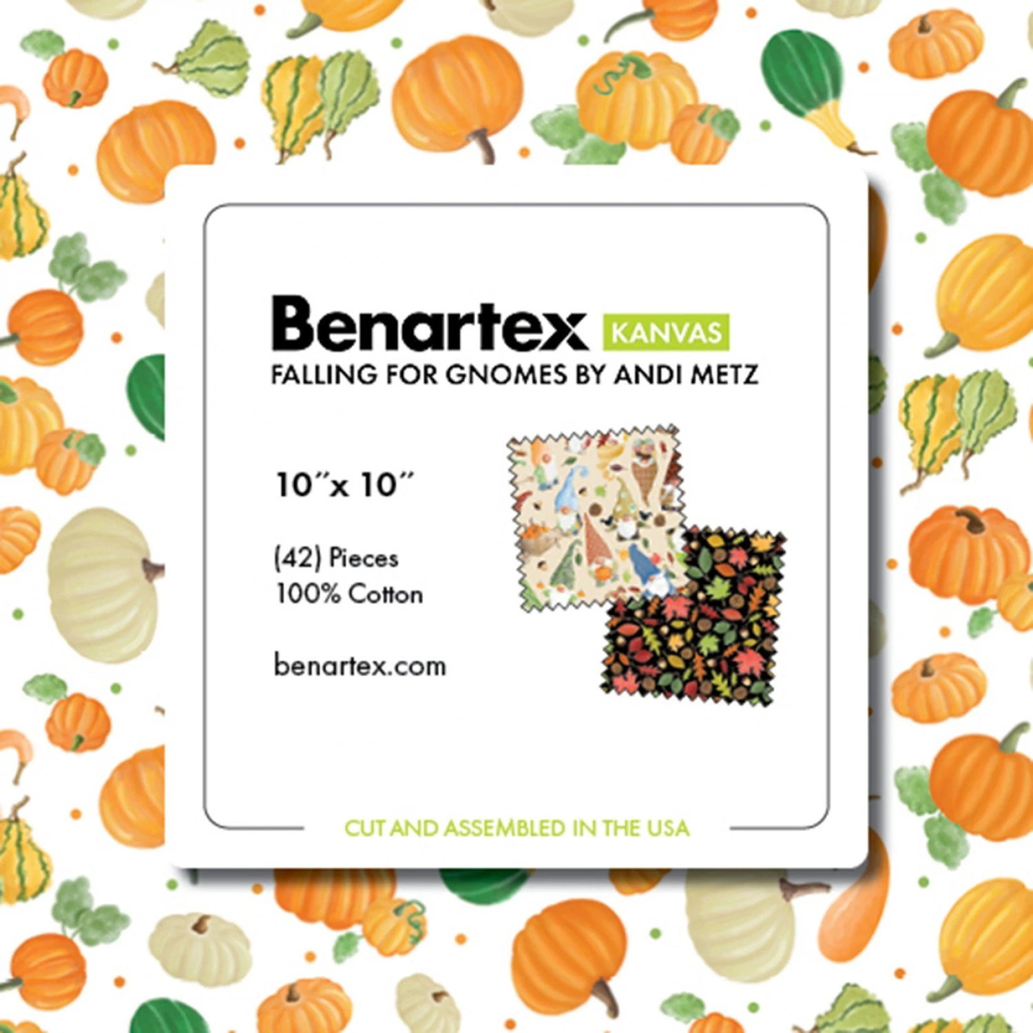 Easy Cakes Quilt Kit Falling for Gnomes 14235 12 Benartex. Approx 68″ x 77″ quilt top depending on block choice used. Includes pattern and 1 layer cake and 2 yards fabric for border/binding.