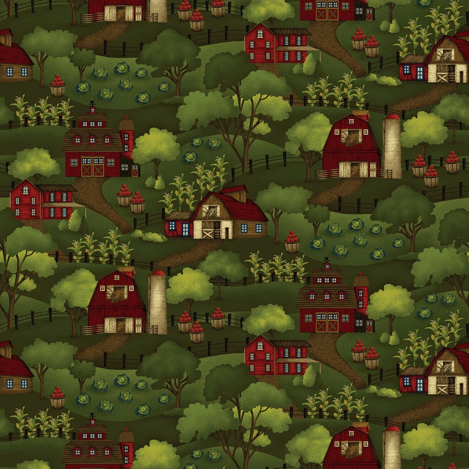 Farm to Market 2565 66 Green Farm Scene Henry Glass. 42″/44″ wide 100% cotton quilt shop quality quilting fabric.
