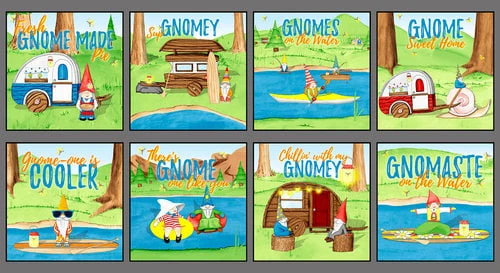 Hangin With My Gnomies 1443 70 Blue Camping Blocks Panel Blank Quilting. Approx 24″ x 44″ repeat panel.