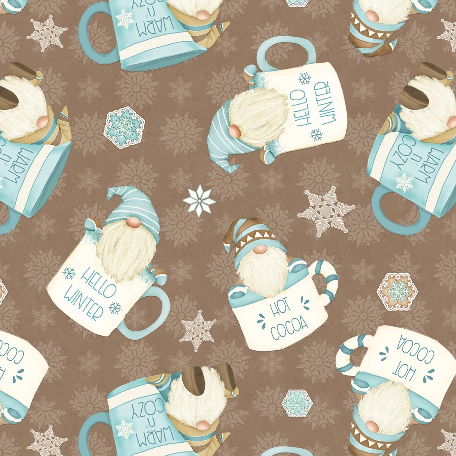 I Love Snow Gnomies Flannel F9640 33 Brown Hot Cocoa Cup Gnomes Henry Glass. 42″/44″ wide 100% cotton quilt shop quality quilting fabric. I Love Sno Gnomies Flannel Quilt Fabric Collection.