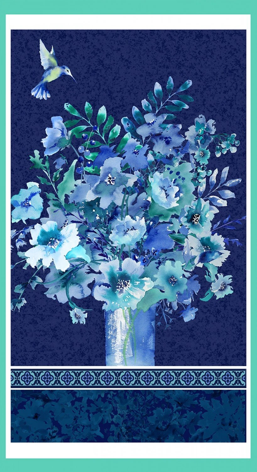 Midnight Sapphire 9390P 77 24 Inch Panel Vase Bouquet Henry Glass. Approx 24″ x 44″ panel. 42″/44″ wide 100% cotton quilt shop quality quilting fabric. Henry Glass Midnight Sapphire quilt fabric collection.