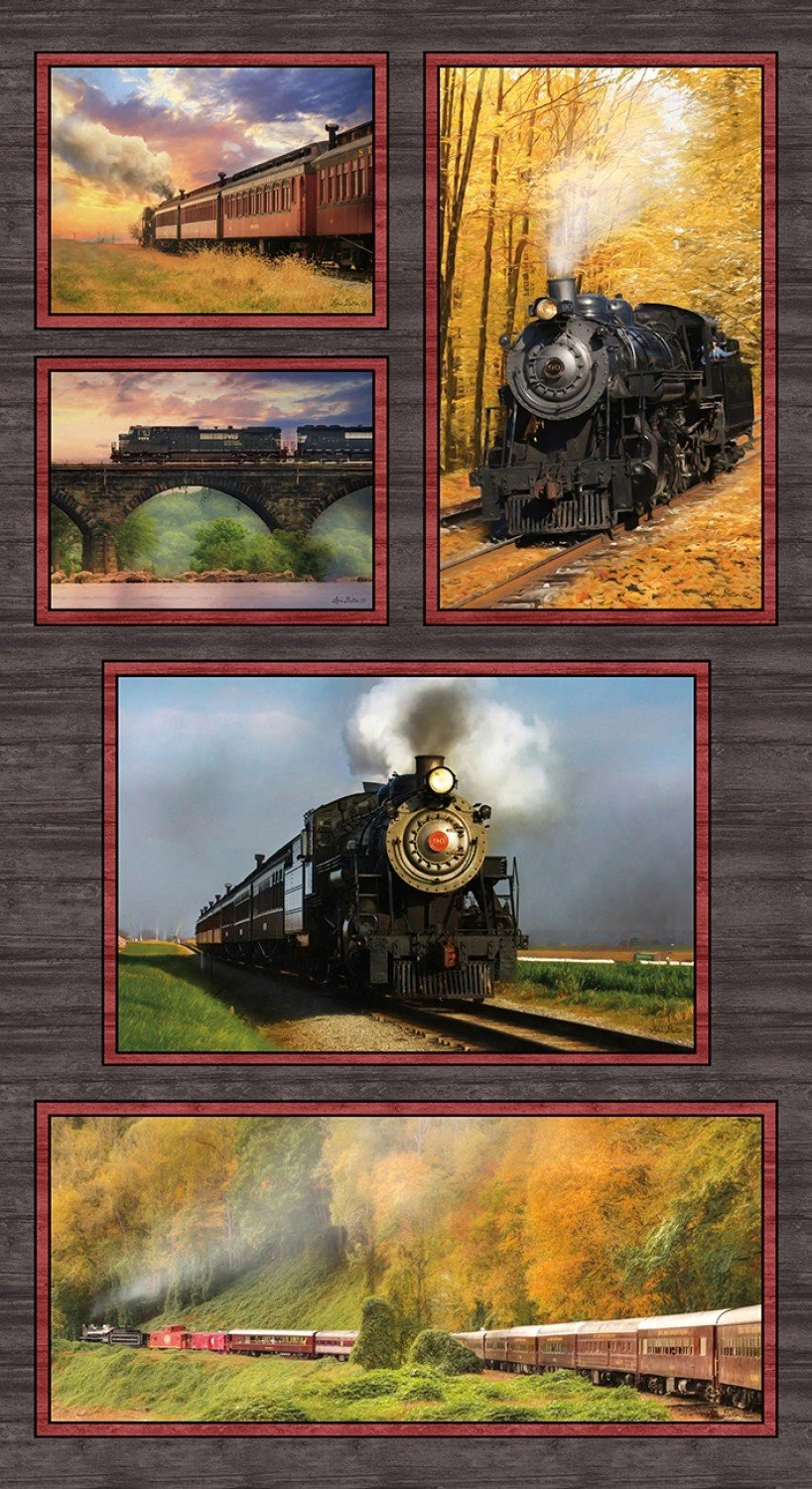 On the Rails 1607 99 Train Panel Benartex. Approx 24″ x 44″ panel. 44″/45″ wide 100% cotton digitally printed quilt shop quality quilting fabric.