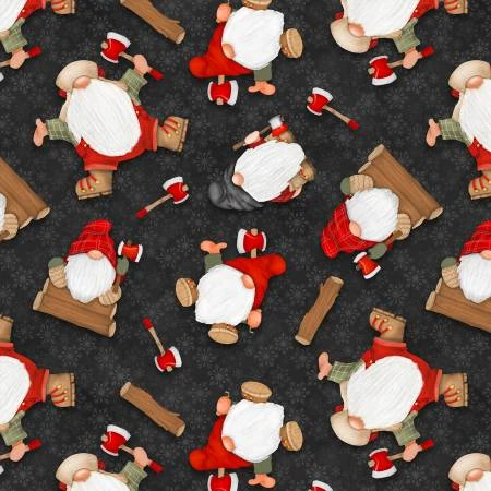 Timber Gnomies 9273 99 Black Tossed Gnomes, Henry Glass. 42″/44″ wide 100% cotton quilt shop quality quilting fabric. Henry Glass Timber Gnomies quilt fabric collection.