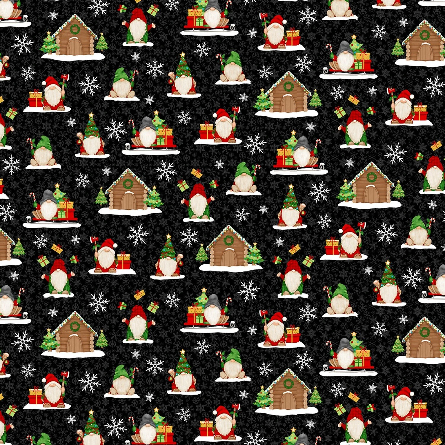Timber Gnomies Tree Farm 307 99 Black Scenic Gnomies Henry Glass. 42″x44″ 100% cotton quilt shop quality quilting fabric. Timber Gnomies Tree Farm quilt fabric collection.