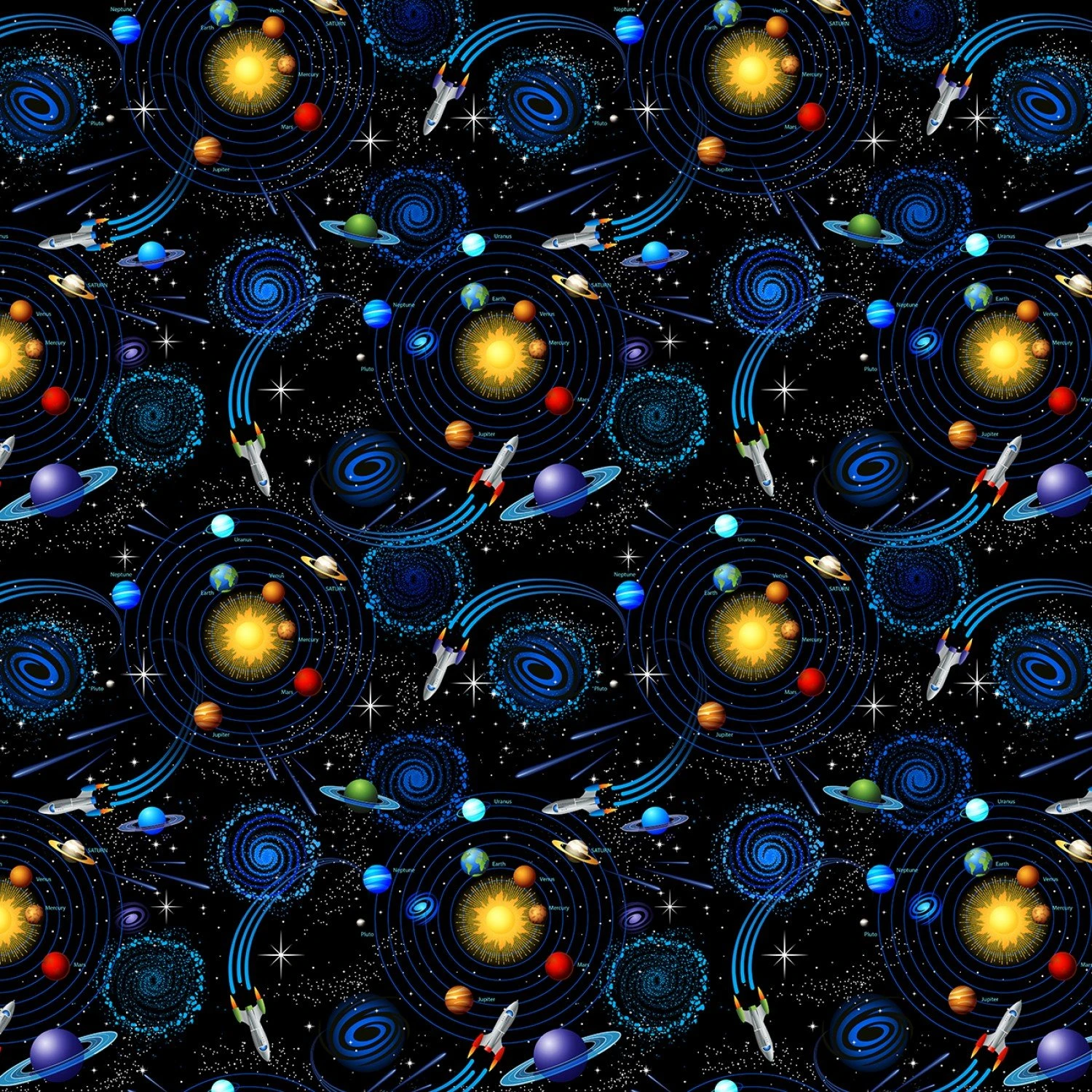 Tossed Solar System CD1692 Black Timeless Treasures. 42/44″ wide 100% cotton quilt shop quality quilting fabric.